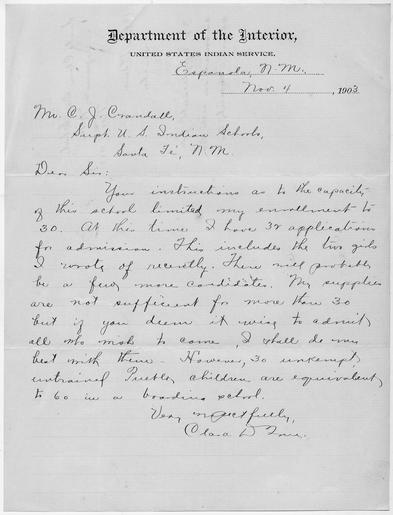 | Keywords: Letter to Superintendent concerning the enrollment capacity of the Santa Clara Day School. - NARA - 293236.tif Scope and content Letter to Supt Crandall from Miss True informing him that she has 32 applications for adminssion but only capacity and supplies for 30 She has difficulty handling 32 Pueblo children in her day school which is not like a boarding school General notes 293236 Local identifier Department of the Interior Bureau of Indian Affairs Santa Fe Indian School Santa Clara Day School - NARA-Author True Clara D Author 8467825 <br /> New Mexico United States North and Central America state 4191641 35 -105 <br /> NARA's Rocky Mountain Region Denver NRGA Building 48 Denver Federal Center West 6th Avenue and Kipling Street Denver CO 80225-0307 1903-11-04 Record group Record Group 75 Records of the Bureau of Indian Affairs 1793 - 1999 Record group ARC 404 Letters Received from Day School Teacher Clara D True compiled 08/29/1902 - 09/17/1906 Series ARC 293139 File unit File unit ARC Variant control numbers NAIL Control Number NRG-75-E38-C19031104 yes Other versions NARA-cooperation PD-USGov 1903 letters Department of the Interior Office of Indian Affairs Schools in New Mexico Native American schools |