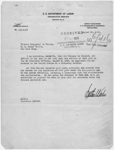 | Keywords: Letter transmitting a $500 bond for Moy Long Lam with additional medical information. - NARA - 278504.tif Scope and content This document is filed with the Chinese Exclusion Act case file on Moy Long Lam General notes 278504 Local identifier Department of Justice Immigration and Naturalization Service Northeast Region INS District No 3 New York NY 06/14/1940 - Most Recent <br /> Department of the Treasury Office of the Secretary of the Treasury 09/02/1789 - Predecessor NARA's Northeast Region New York City NRAAN 201 Varick Street New York NY 10014-4811 1922-08-29 Record group Record Group 85 Records of the Immigration and Naturalization Service 1787 - 2004 Record group ARC 414 Chinese Exclusion Act Case Files compiled ca 1882 - ca 1960 Series ARC 584668 File unit Chinese Exclusion Act case file for Moy Long Lam 05/03/1890 - 05/07/1948 File unit ARC 278492 Variant control numbers NAIL Control Number NRAN-85-CHINEXCL-6 416 -12 yes Other versions NARA-cooperation PD-USGov Chinese Exclusion Act |