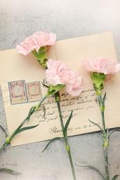 Keywords: letters envelope old antique post labeled paper cloves flowers three pink carnation pink number of pieces cut flowers close still life