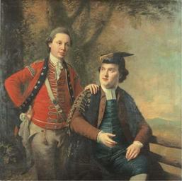 | Keywords: Levett Wilford NathanielHone.jpg Painting en Double portrait of General Richard Wilford of the British Army and his contemporary Sir Levett Hanson The figures are three-quarter length Wilford standing in his uniform of the Light Company of the 2nd Queen's Royal Regiment of Foot; courtier and authority on knighthood Hanson seated in academic robes Both beside a tree in an extensive background 1777 Oil on canvas cm 137 1 137 1 unknown Christie's online 4020487 other versions PD-old-100 DEFAULTSORT 1777; Richard Wilford Levett Hanson Nathaniel Hone the Elder 18th-century portrait paintings location missing 1777 oil on canvas paintings 1777 portrait paintings Male 18th-century men of Great Britain 18th-century oil portraits of sitting men at three-quarter length 18th-century oil portraits of standing men at three-quarter length wearing military uniforms Portraits with 2 persons Portraits with natural background Right hand on hip in portrait paintings |