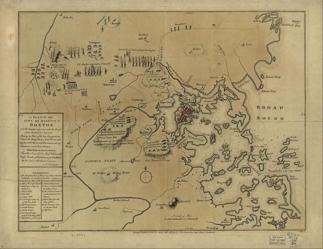 Keywords: Lexington Concord Siege of Boston.jpg Battles of Lexington and Concord and the Siege of Boston From the Library of Congress http //memory loc gov American Memory <br> G3764 B6S3 1775 D4 Vault<br> g3764b ar090000<br> http //hdl loc gov/loc gmd/g3764b ar090000<br> 150px Large text box <div align center ><span style font-variant small-caps; >a PLAN of the</span><br/> <span style font-variant small-caps; >TOWN</span> and <span style font-variant small-caps; >HARBOUR</span> of<br/> <span style font-variant small-caps; ><big>Boston </big></span><br/> and the Country adjacent with the Road<br/> from Boston to Concord<br/> Shewing the Place of the late Engagement<br/> between the King's Troops the Provincials <br/> together with the several Encampments of<br/> both Armies in about Boston <br/> Taken from an Actual Survey<br/> Humbly Inscribed to Rich<sup> d</sup> Whitworth<br/> Esq<sup>r</sup> Member of Parliament for Stafford<br/> by his most Obedient Servant J De Costa</div> Legend <span style font-variant small-caps; >References </span> The Nautilus Man of War lying above Charles Town Ferry 400 yards to Boston The Lively Man of War Men of War before Bosto<sup>n</sup> Gen<sup> l</sup> Gage's Camp on the Common Bacon Hill i e Beacon Hill Fort Hill Copps Hill Gen<sup> l</sup> Gage's Line on on Boston Neck The Fortification South Battery North Battery Provincial Battery gained by the King's Troo<sup> ps</sup> in the Battle 17 of June 1775 Bunkers Hill at Cha<sup> s</sup> T School Hill at D<sup> o</sup> Stores Cannon destro<sup> d</sup> by the King's Troops The Schooner burnt at Nodles Island by Gen<sup> l</sup> Putman Watch Boat from the Men of War Gen<sup> l</sup> Thomas's lines on Boston Neck Mill Pond Text along the bottom London Publish'd as the Act directs July 29<sup>th</sup> 1775 by J De Costa Red Croſs Street Southwark Old maps of the American Revolution Battles of Lexington and Concord Military maps Sieges Fort Hill Boston South Battery Boston LOC-map g3764b ar090000 PD-old-100 Battle of Bunker Hill
