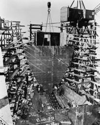 Keywords: Liberty ship construction 08 collision bulkhead.jpg Construction of a Liberty ship at Bethlehem-Fairfield Shipyards Inc Baltimore Maryland USA in March/April 1943 <br>Original caption The sixteen-ton chain locker and collision bulkhead assembly being lowered into position in the forepeak of the ship LOC-image fsa 8e01462 1943-04 United States Office of War Information Overseas Picture Division Washington Division; 1944 frame removed PD-USGov Liberty ships