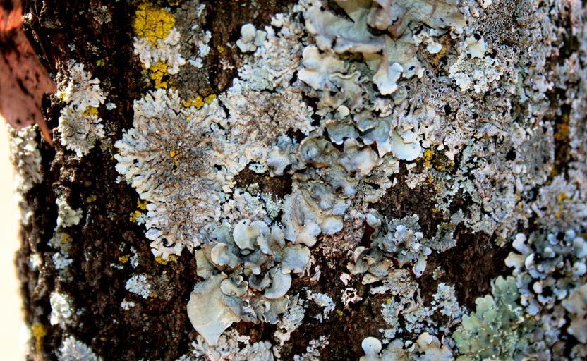 Keywords: lichen tree trunk shady side light grey spots of color textured frilly moss symbiosis fungus algae tree bark