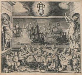 | Keywords: Licht der Zeevaert, Frontispiz.jpg Frontispiz aus dem Segelhandbuch žLicht der Zeevaert Book frontispiece of the sailing handbook The light of navigation Creator Willem Janszoon Blaeu 1608 Kupferstich Universitätsbibliothek Marburg de Das Blatt stellt die Wissenschaften dar welche die Seefahrt ermöglichen In der Mitte unter dem Licht der Erkenntnis ein Lehrer der auf Globen und Karten zeigt Auf der linken Seite der Meeresgott Neptun rechts Äolus Gott der Winde http //www uni-marburg de/aktuelles/news/2010a/0504a Segelandbuch mit folgenden Navigationsinstrumenten auf dem Frontispiz Kompaß Sanduhr See-Astrolab Erd- und Himmelsgloben Zirkel Jakobsstab und Astrolab Gudrun Wolfschmidt Sterne weisen den Weg- Geschichte der Navigation BoD “ Books on Demand 2009 Abb10 2 S 325 ISBN 3837039692 9783837039696 http //books google de/books id kej9j7KW7IQC printsec frontcover v onepage q f false Google Books<br />en The picture shows the sciences which make seafaring possible In the middle under the light of knowledge a teacher points at globes and maps On the left side Neptune the god of water and the sea on the right Aeolus the ruler of the winds Sailing handbook showing the following navigational equipment on the book frontispiece compass hourglass mariner's astrolabe terrestrial and celestial globes divider Jacob's staff and astrolabe http //archiv ub uni-marburg de/eb/2010/0007/ PD-Art Other versions PD-old-100 Willem Janszoon Blaeu Philipps-Universität Marburg Navigation tools Poseidon Aeolus 1600rs engravings Jacob's staff Astrolabes Dividers People with globes in art 1608 books |