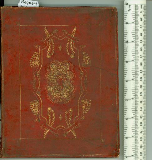 | Keywords: L'idee d'une reine parfaite en la vie de S Marguerite - Upper cover (287b8).jpg Style Cottage roof Bird's head Centrepiece made of small tools Curl floral Worm; Caption Upper cover; Colour Red; Edge Gilt exhibition history Decorative Technique Tooled in gold; Cover Material Goatskin includes morocco turkey etc Centrepieces slightly damaged by later overlay of royal arms Worm / windsock shape motifs 6 raised spine bands unusual on a small book object history Text 1660; Douai; Unspecified object type Cc-zero place of creation Binding England place of discovery Unspecified British Library image http //www bl uk/catalogues/bookbindings/LargeImage aspx RecordId 020-000014753 ImageId ImageId 54156 Copyright BL L'idee d'une reine parfaite en la vie de S Marguerite Uploaded with GWToolset L'idee d'une reine parfaite en la vie de S Marguerite - Upper cover 287b8 http //www webarchive org uk/bldatasets/bindings/287b8 jpg Bookbinding 17th-century bookbinding British Library Bookbindings |