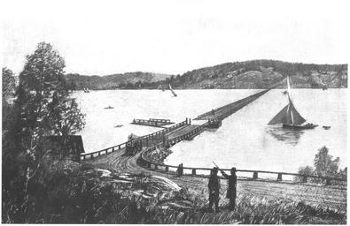 Keywords: Lidingöbron 1884.jpg The second floating bridge built between Lidingö and Stockholm 1884 Scanned from a paper image drawn by H Feyting 1884 View from Ropsten Stockholm 2007-01 Lidingo PD-art Lidingöbron Floating bridges 1884 in Stockholm