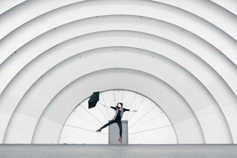 Keywords: life beauty scene artistic dance jump leap of faith happy umbrella girl woman fit fitness healthy black and white monochrome architecture composition portrait