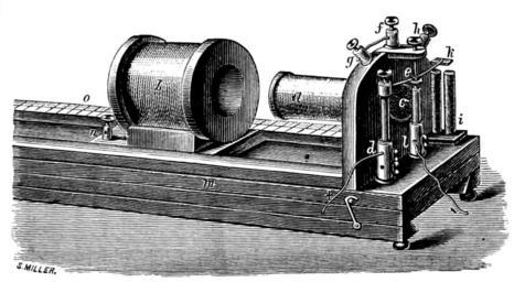 | Keywords: Life in Motion Fig 19.png en Fig 19 ”Induction coil of du Bois Reymond a primary coil; b secondary coil; c bunch of wires in centre of primary coil for increasing intensity of induction currents; d binding screw for attachment of wire from galvanic element The current passes up the pillar d along steel spring to e thence to the screw the point of which touches the back of the spring at e; from f through wire of primary coil to i round the two pillars of soft iron i which it renders magnetic and thus draws down the head of the spring k; this interrupts the current at e thus breaking the contact of the spring at the screw point When the current is thus interrupted the spring flies up by its elasticity and again establishes the circuit at e This interruption was originally invented by P Wagner Life in Motion or Muscle and Nervehttps //archive org/details/b21929786 John Gray McKendrick 1892 1926 Life in Motion book Electric switches |