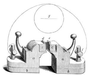 | Keywords: Life in Motion Fig 69.png en Fig 69 ”Arrangement of du Bois Reymond's troughs a a troughs of zinc; b vulcanite plates for insulation; c c paper pads; d e clay pads; f f connections for wires leading to galvanometer g Life in Motion or Muscle and Nervehttps //archive org/details/b21929786 John Gray McKendrick 1892 1926 Life in Motion book Biology experiments |