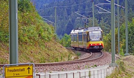 | Keywords: light rail railway line northern black forest slope steep track baiersbronn murg valley murgtalbahn freudenstadt forest high valley mountain railway highlands region freudenstadt frühherbst black forest overland track karlsruhe avg curve tram regional train regional traffic light rail network coniferous forest fir forest conifers öpnv |