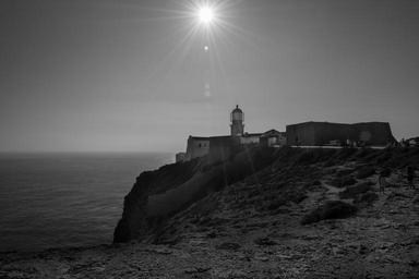 Keywords: lighthouse beacon cliff coast ocean shore sun landscape landmark cape saint vincent sea sunlight black and white