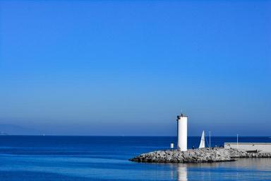 Keywords: lighthouse breakwater mooring harbour port navigation harbor blue tranquil summer signal coastal marine warning beacon tower placid sentinel