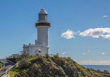 Keywords: lighthouse coastline navigation landmark beacon sky scenic white maritime safety byron bay australia