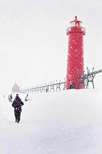 Keywords: lighthouse red michigan people winter walking snow ice cold