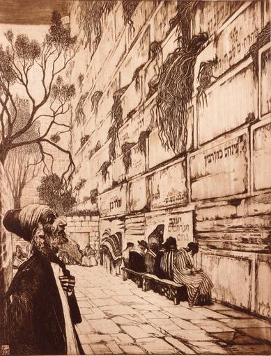 | Keywords: Lilien Praying at the Western wall.jpg en Praying at the Western wall by Ephraim Moshe Lilien <br> Etching on paper 35X25 cm <br> Literature Ephraim Moshe Lilien Drawing in the Light Published by the Tel Aviv Museum of Art p 131 illustrated 1913 https //bidspirit com/portal/ /lotPage/source/catalog/auction/53aa71c1e4b032e680e98723/lot/544ad6dee4b03e09caaf79f7 Bidspirit Ephraim Moshe Lilien other versions PD-Art Religious themes by Ephraim Moshe Lilien Western Wall in art Jewish people praying |