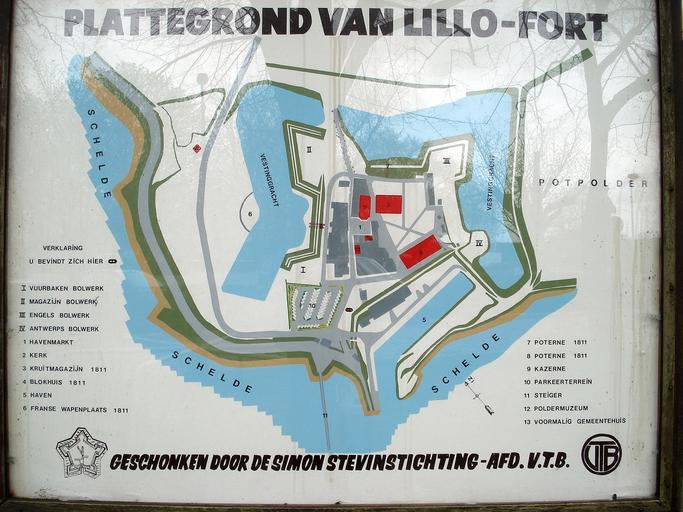 Keywords: Lillo plattegrond.JPG nl Lillo-Fort bij Antwerpen Plattegrond die uithangt aan de ingang van het dorp fr Lillo-Fort au nord d'Anvers sur l'Escaut Plan affiché à l'entrée de la localité Légende Schelde Escaut; vestinggracht douve; potpolder polder inondable; I Vuurbakenbolwerk bastion de la Balise à feu; II Magazijnbolwerk bastion de l'Entrepôt; III Engels bolwerk bastion anglais; IV Antwerps Bolwerk bastion anversois; 1 Havenmarkt pl du Marché; 2 Kerk église; 3 Kruitmagazijn; magasin à poudre; 4 Blokhuis casemate; 5 Haven port; 6 Franse wapenplaats place d'armes française; 7 Poterne; 8 Poterne; 9 Kazerne caserne; 10 Parkeerterrein aire de stationnement; 11 Steiger embarcadère; 12 Poldermuseum musée; 13 Voormalig gemeentehuis ancienne maison communale mairie own Photo personnelle Torsade de Pointes 2008-04-03 Lillo Fortresses in Belgium |