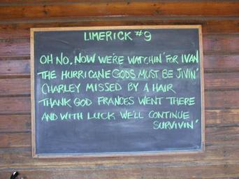 | Keywords: hurricanes florida state library and archives of florida statelibraryandarchivesofflorida key west keywest dale m. mcdonald dalemmcdonald limericks monroe county monroecounty blackboards humor лимерик ураган флорида ураган иван ураганиван hurricane ivan hurricaneivan 2004 plaque sign signboard text Local call number: DM1571 Title: [Limerick at the Half Shell Raw Bar during evacuation for Hurricane Ivan: Key West, Florida] Personal Author: McDonald, Dale M. Date: Photographed on September 11, 2004. Physical descrip: 1 photoprint: col.; 8 x 8 in. Series Title: (Dale M. McDonald Collection) Repository: State Library and Archives of Florida, 500 S. Bronough St., Tallahassee, FL 32399-0250 USA. Contact: 850.245.6700. Archives@dos.state.fl.us Persistent URL: www.floridamemory.com/items/show/98910 Local call number: DM1571 Title: [Limerick at the Half Shell Raw Bar during evacuation for Hurricane Ivan: Key West, Florida] Personal Author: McDonald, Dale M. Date: Photographed on September 11, 2004. Physical descrip: 1 photoprint: col.; 8 x 8 in. Series Title: (Dale M. McDonald Collection) Repository: State Library and Archives of Florida, 500 S. Bronough St., Tallahassee, FL 32399-0250 USA. Contact: 850.245.6700. Archives@dos.state.fl.us Persistent URL: www.floridamemory.com/items/show/98910 |