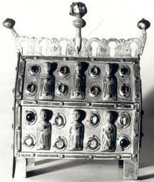 | Keywords: Limoges Reliquary.JPG Reliquary box copper enamel semi-precious stones gilding Relikwiarz skrzynkowy miedź emalia kamienie półszlachetne złocenie cm 16 24 Catalogue of stolen and missing cultural achievements / comp Jan Świeczyński; Ośrodek Informacyjno-Koordynacyjny Ochrony Obiektów Muzealnych Warsaw 1988 Editor Wojciech Jaskulski Piotr Ogrodzki See also http //www mkidn gov pl/kolekcje/ Department of National Heritage Wartime losses an official webpage of Polish Ministry of Culture Art and National Heritage 13th century; photo made before 1939 Limoges; author of photo unknown PD-Polish Anonymous-EU Goldsmithery lost in Poland during World War II Romanesque reliquaries Limoges champlevé |