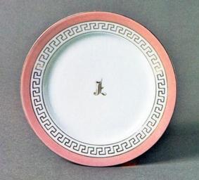 | Keywords: Lincoln pink set - 1865.jpg en Dinner plate which was part of a porcelain china dining set by First Lady Mary Todd Lincoln in 1861 Although owned by the First Family it was never used in the White House in Washington D C in the United States Mrs Lincoln had ordered a very expensive exquisitely decorated Solfering purple -bordered china service in April 1865 Heavily damaged with many pieces stolen it was replaced with a much less expensive plainer china service in late 1864 which had a simple buff band around the border In early 1865 Mrs Lincoln ordered yet a third set of china Records regarding this set are minimal and it is unclear if it was purchased or was a gift from the manufacturer The set was clearly ordered by Mrs Lincoln before May 26 1865 but did not arrive until after July 26 1865 once she had left Washington D C and settled at the Hyde Park Hotel in Hyde Park Illinois The pink set was provided by China Hall an establishment run by James K Kerr of Philadelphia The china has a pink border Inside the border is a gold Greek fret motif and a gold monogram capital letter L is centered in the plates and saucers Kerr most likely decorated the piece or at least provided the gilding and monogram Although the manufacturer is unclear the set was probably made in France Detweiler Susan G 1975 American Presidential China Washington D C Smithsonian Institution p 51 Detweiler Susan G 1975 American Presidential China Washington D C Smithsonian Institution p 51 1975 White House china of the Abraham Lincoln administration PD-USGov |