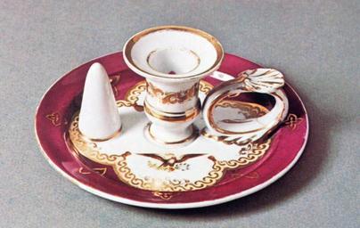 | Keywords: Lincoln solferino toilet set - candlestick - 1861.jpg en Candlestick holder and candle cap purchased as part of a toilet set by First Lady Mary Todd Lincoln in 1861 and used in the White House in Washington D C in the United States The set is based on the Solferino porcelain china dining service ordered by Mrs Lincoln in April 1861 The set is named for the purple color known as solferino which borders the items The toilet set was ordered on July 18 1861 and consisted of two services The one for Abraham and Mary Lincoln consisted of a ewer and basin covered chamber pot soap box brush tray jug foot bath and slop jar It cost 45 and was decorated with the solferino border although the Alhambra braided gold rope edging was replaced with a quatrefoil and tassel motif The Great Seal of the United States present on the dining service was replaced with a Gothic ML in the center A plain white toilet set with the same items formed the second set This less fancy set cost just 24 50 Mrs Lincoln ordered a third fancy toilet set this one decorated with the U S coat of arms on July 30 1861 It appears intended for Mrs Lincoln's bedroom as it also included a mouth ewer sponge box power box and pair of candlesticks The cost of the plain toilet set was 115 Detweiler Susan G 1975 American Presidential China Washington D C Smithsonian Institution p 46 Detweiler Susan G 1975 American Presidential China Washington D C Smithsonian Institution p 46 1975 Washstand sets 1861 Lincoln White House china of the Abraham Lincoln administration PD-USGov |
