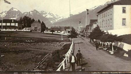 MAKE A MEME View Large Image Lincoln St, Sitka, Alaska, ca 1897 (LAROCHE 172).jpeg Photograph Creator Frank La Roche Looking east Caption on image Indian Ave Sitka To the far left is the Marine Corps Barracks built in 1892 to the right of that is the store built by ...