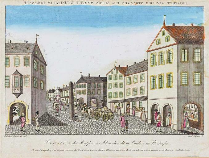 | Keywords: Lindau Alter Markt Gmeinder Pfauz.jpg Prospect von der Strassen des Alten Marckt in Lindau im Bodensee Guckkastenblatt Kol Kupferstich von Andreas Pfauz nach J Anton Gmeinder Augsburg um 1780 Namenszüge in der http //www zeller de/ ~ 1780 Andreas Pfauz nach J Anton Gmeinder <gallery>File Gemeinder Leizel Lindau Alter Markt jpg</gallery> PD-old-100 Images from Auktionshaus Zeller History of Lindau Bodensee Germany in the 1780s Peep show cards Shopping in art Johann Anton Gmeinder | ||||
