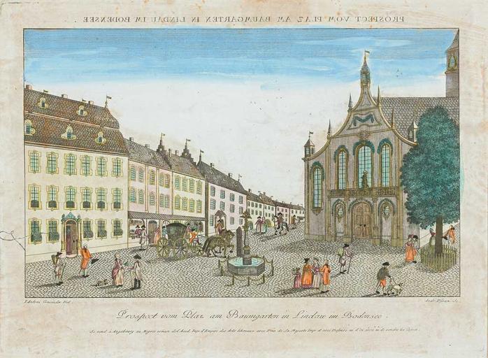 | Keywords: Lindau Platz am Baumgarten Gmeinder Pfauz.jpg  Prospect vom Plaz am Baumgarten in Lindau im Bodensee Guckkastenblatt Kol Kupferstich von Andreas Pfauz nach J Anton Gmeinder Augsburg um 1780 Schefold Nr 46229 Platte ca 32 x 44 cm http //www zeller de/ ~ 1780 Andreas Pfauz nach J Anton Gmeinder <gallery>Gemeinder Leizel Lindau Platz am Baumgarten jpg</gallery> PD-old-100 Images from Auktionshaus Zeller History of Lindau Bodensee Germany in the 1780s Peep show cards St Stephan Lindau Bodensee Johann Anton Gmeinder |