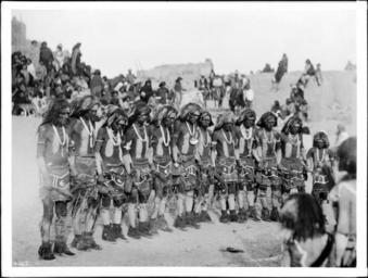 | Keywords: Line of a dozen Hopi snake priests singing songs and prayers before the kiva or kisi at the pueblo of Oraibi, Arizona, 1898 (CHS-4662).jpg en <br> Line of a dozen Hopi snake priests singing songs and prayers before the kiva or kisi at the pueblo of Oraibi Arizona 1898 Photograph of a line of a dozen Hopi snake priests singing songs and prayers before the kiva or kisi at the pueblo of Oraibi Arizona 1898 They wear traditional skirts moccasins necklaces and feathers Their faces chests and arms are painted white A large group of spectators including some white men are visible in the background standing before and perched on the walls of the buildings of the pueblo Call number CHS-4662 Legacy record ID chs-m16985; USC-1-1-1-13888 Photographer James George Wharton Filename CHS-4662 Coverage date 1898 Part of collection California Historical Society Collection 1860-1960 Type images Geographic subject city or populated place Oraibi Repository name USC Libraries Special Collections Accession number 4662 Microfiche number 1-170- Archival file chs_Volume97/CHS-4662 tiff Part of subcollection Title Insurance and Trust and C C Pierce Photography Collection 1860-1960 Repository address Doheny Memorial Library Los Angeles CA 90089-0189 Geographic subject country USA Format aacr2 3 photographs glass photonegative photoprints b w ; 17 x 22 cm 21 x 26 cm Rights Digitally reproduced by the USC Digital Library; From the California Historical Society Collection at the University of Southern California Subject adlf tribal areas Project USC Repository email specol usc edu Identifying number plate no James-355 Contributing entity California Historical Society Date created 1898 Publisher of the digital version University of Southern California Libraries Format aat photographic prints; photographs Geographic subject state Arizona Subject file heading Indians -- Hopi -- Snake Dance Geographic coordinates -110 639717 35 876389; -110 639442 35 876389; -110 639442 35 874722; -110 639717 35 874722; -110 639717 35 876389 Format glass plate negatives Access conditions Send requests to address or e-mail given Phone 213 821-2366; fax 213 740-2343 Geographic subject county Navajo Subject lcsh Indians of North America; Hopi Indians; Rites and ceremonies Subject Hopi Snake Dance Ceremony 1898 date created George Wharton James 1858 1923 http //digitallibrary usc edu/cdm/ref/collection/p15799coll65/id/16904 PD-old-70-1923 Images from USC Digital Library uploaded by Fæ Photographs by George Wharton James California Historical Society Collection 1860-1960 Glass plate negatives Hopi men |
