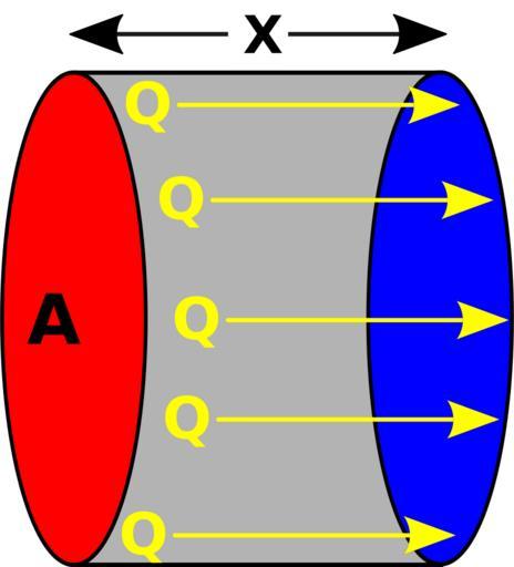 Keywords: Linear Heat flow.svg A diagram showing the flow of heat from hot to cold to illustrate thye Law of heat conduction Fourier's law when integrated own 2007-04-28 Tooto Heat conduction Physics diagrams