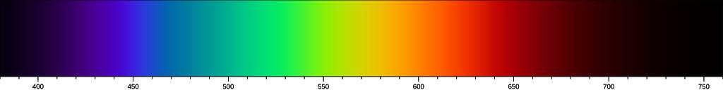 | Keywords: Linear visible spectrum CIECAM02.svg en Linear representation of the visible spectrum The XYZ coordinates were taken from the CIE homepage The method used to calculate the RGB values are adopted from File Linear visible spectrum svg i e doing a binary search along a constant-hue line from the spectral colour point to the RGB gamut border In contrast to the method in that image the spectral colour was taken every 1 nm and the brightness was not decreased towards the grey axis The spectral intensity was weighted with a 10000 K blackbody spectrum since the projection onto the sRGB gamut somehow suppresses part of the blue In addition a gamma correction of 1 2 was applied in the linear RGB space to enhance the visibility at the violet and red ends The brightness profile is an interpolation between the actual spectral brightness and a Gaussian profile centered at 555 nm with sigma 50 nm in order to reduce the somewhat artificial-looking brightness gap between blue and green Finally a Gaussian blur with sigma 7nm was applied to smooth the remaining jumps in chromaticity The scale indicates the approximate wavelength in nanometres 2016-12-17 own SiriusB other versions cc-zero Visible spectrum illustrations |