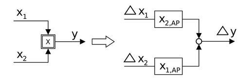 Keywords: Linearisierung multiply.svg Eine Multiplikation im Signalflussplan ersetzt durch eine Addition Arbeitspunkte x1 AP x2 AP und yAP wurden zur übersichtlicheren Darstellung weggelassen Own Mik81 Cybernetic diagrams Block diagrams