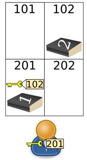 | Keywords: Linked list post office box analogy.svg en The post office box analogy for a linked list Suppose Alice is a spy who wishes to give a codebook to Bob by putting it in a post office box and then giving him the key However the book is too thick to fit in a single post office box so instead she divides the book into two halves and purchases two post office boxes In the first box box 201 she puts the first half of the book and a key to the second box and in the second box box 102 she puts the second half of the book She then gives Bob bottom a key to the first box Derived from public domain works File Paperback book black gal svg File Public key shared secret svg File Emblem-person-blue svg 2011-06-14 own Dcoetzee Linked list post office box analogy 1 svg Linked list post office box analogy 2 svg Linked list post office box analogy 3 svg cc-zero Uploaded with UploadWizard Linked lists |