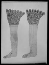 | Keywords: Linnestrumpa, strövling - Livrustkammaren - 77191.tif Strumpa av tuskaftat linne trÃ¥dtäthet 37x37 per cm2 Tillskuren i fyra delar tvÃ¥ kragstycken ben och fot som är hopsydda med efterstygn Kragens övre kant avslutas med 14 flikar formade som bÃ¥gar Formen pÃ¥minner om reticella-spetsens bÃ¥gformade kanter Den är fodrad med ett grövre linne som skyddar broderiets baksida Kragens höjd är 28 cm och dess övre omkrets 68 cm Broderade i svart silke och guldtrÃ¥d huvudsakligen i stjälkstygn Motivet är lika pÃ¥ kragens bÃ¥da sidor Huvudmotivet är ett ymnighetshorn med frukter som äpple päron och druvor Vid sidan av hornet en fÃ¥gel Den Ã¥terstÃ¥ende ytan täcks av slingrande blad och stjälkar samt blommor som tulpan ros och liljekonvalj PÃ¥ varje flik pÃ¥ kragen är en liten blomma broderad Motiven är dekorerade med guldtrÃ¥dar lan pÃ¥ silkekärna som sytts i flätmönster Över sömmarna och kring den övre kanten ligger ett slätt guldband Broderiet överensstämmer med den engelska typen av broderi med svart trÃ¥d som man kan se pÃ¥ linneplagg frÃ¥n sent 1500-tal och tidigt 1600-tal Strumpans ben respektive fot är skurna pÃ¥ snedden för att ge bättre elasticitet och passform Benstycket har en liten triangulär skarvbit placerad vid mittbaksömmen uppe vid kragen Foten är skarvad framme vid tÃ¥n Stockings or w Boothose en of linen 37x37 thread count per square cm Cut into four parts two cuffs legs and feet which are sewn with backstitch The upper edge of the cuff ends with 14 arch-shaped tabs The shape of the tabs is reminiscent of reticella needlelace -edgings The cuff is lined with a coarse linen that protects the back of the embroidery The cuff height is 28 cm and its upper circumference is 68 cm The cuffs are embroidered in black silk and gold wire primarily in stem stitch The motif is the same on both sides of the collar The main subject is a cornucopia with fruits incluidng apples pears and grapes At the side of the horn is a bird The remaining area is covered by meandering leaves and stems and flowers such as tulips roses and lily of the valley Each tab on the collar has a small embroidered flower The motifs are decorated with gold threads gold-wrapped silk core sewn in a cable pattern Over the seams and around the top edge is a plain gold band The embroidery is consistent with the English type of embroidery with black thread blackwork that can be seen on the linen garments from the late 1500s and early 1600s The sock and foot pieces are cut on the bias to provide better elasticity and fit The leg piece has a small triangular gusset from the middle of the back seam up to the cuff The foot is seamed ‹ ‹in front of the toe original caption linnestrumpa strövling - LRK 31124 Slaget vid Lützen 1632 size mm 630 häl-krage size mm 280 krage size mm 320 fot g 116 LRK Gustav II Adolf av Sverige Gustavus Adolphus of Sweden Modelejon 2002 Jubileumsutst Lützen-Kapelle 2007 2007 place of origin original filename LN_A01469_001469 67690 inventory number LRK 31124 77191 CC0 Linnestrumpa strövling - Livrustkammaren - 77191-negative tif <gallery caption Different images of same object > File Linnestrumpa strövling - Livrustkammaren - 68631 tif File Linnestrumpa - Livrustkammaren - 25703 tif File Linnestrumpa buren av Gustav II Adolf i slaget vid Lützen - Livrustkammaren - 35185 tif File Linnestrumpa strövling - Livrustkammaren - 8705 tif File Linnestrumpa buren av Gustav II Adolf i slaget vid Lützen - Livrustkammaren - 43744 tif File Linnestrumpa strövling - Livrustkammaren - 146 tif File Linnestrumpa strövling - Livrustkammaren - 60069 tif File Linnestrumpa strövling - Livrustkammaren - 147 tif File Linnestrumpa buren av Gustav II Adolf i slaget vid Lützen - Livrustkammaren - 52304 tif File Linnestrumpa strövling - Livrustkammaren - 77190 tif File Linnestrumpa buren av Gustav II Adolf i slaget vid Lützen - Livrustkammaren - 26624 tif File Linnestrumpa strövling - Livrustkammaren - 17267 tif </gallery> < Clothes of Gustav II Adolf Stockings Linen clothing Blackwork embroidery 1630s fashion Media contributed by LSH dim-with multiple size templates Media contributed by LSH unmatched objKeyword Stockings in Livrustkammaren Images from Livrustkammaren Embroidered clothing Media contributed by LSH 2013-10 |