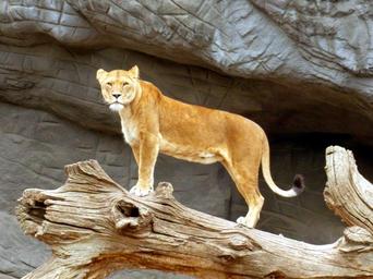 Keywords: lioness lion cat lion females predator wildcat großkartze attention female mammal fur carnivores zoo creature graceful nature animal portrait stand log rock grey brown animal world