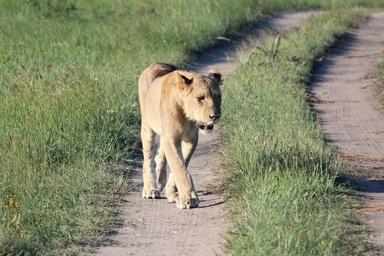 Keywords: lioness wild life predator walk dirt road south africa