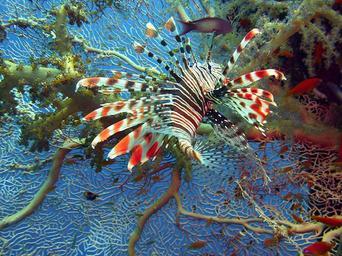 Keywords: lionfish lion fish red fire fish diving underwater coral reef water fish meeresbewohner underwater world coral reef blue salt water colorful toxic risk