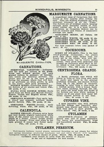 | Keywords: Lippincott seeds (15750727664).jpg MINNEAPOLIS MINNESOTA <br> 21 <br> MMrtGUERITE CARM riON <br> CARNATIONS <br> PERENNIAL VABIET1E8 Indispens- <br> able for both pot culture In the green- <br> house and window garden and open <br> ground culture In summer; of Innumer- <br> able colors and delicious perfume The <br> plants may be set in the open ground <br> during the summer where they will flow- <br> er as profusely as when grown in pots <br> in the house Half hard perennials <br> DOUBLE MIXED Producing many dou- <br> ble flowers of all shades and colors Pkt <br> 100 seeds 8 cts <br> EXTRA FINE DOUBLE MIXED Seeds <br> saved from the finest and choicest German <br> French Italian and English stocks Pkt <br> 100 seeds 10 cts <br> GBENADIN SCARLET Very early hab- <br> it dwarf and compact brilliant double <br> scarlet flowers Pkt 100 seeds 10 cts <br> GRENADIN WHITE Double early <br> flowering white Pkt 100 seeds 10 cts <br> CALENDULA <br> MARGUERITE CARNATIONS <br> A magnificent class of Carnations that will <br> bloom in four months after sowing the <br> seed They are without exception the most <br> abundant bloomers of all the Pinks <br> The flowers are of brilliant colors ranging <br> through many beautiful shades of reds <br> pinks whites etc It Is a most valuable <br> acquisition as Carnation flowers can be <br> had all summer and winter if consecutive <br> sowings are made <br> MARGARET MIXED All Colors 150 <br> seeds 5 cts <br> MARGARET WHITE 100 seeds 10 cts <br> MARGARET YELLOW 100 seeds 10 cts <br> MARGARET PINK 100 seeds 10 cts <br> MARGARET RED 100 seeds 10 cts <br> The four separate colors one packet of <br> each 30 cts <br> COCKSCOMB <br> QUEEN OF DWARFS This is the best <br> dwarf-growing Cockscomb; the plants <br> grow only about eight inches high are <br> firmly set in the crown with well bal- <br> anced large heads ten to twelve Inches <br> across They grow very uniformly and <br> present an unusually solid effect in col- <br> or which is rich ruby red of extreme <br> brilliancy Pkt 200 seeds 4 cts <br> CENTROSEMA GRANDI- <br> FLORA <br> A hardy perennial vine which will <br> bloom in June or July from seed sown <br> in April and bears in the greatest <br> profusion Inverted pea-shaped flowers <br> from 1 to 21 inches in diameter <br> ranging in color from a rose-violet to <br> a reddish purple with a broad feath- <br> ered white marking through the cen- <br> ter while the large buds and backs of <br> the flowers are pure white making It <br> appear as if one plant bore many dif- <br> ferent colored flowers at one time <br> Pkt 50 Needs 4 cts <br> CYPRESS VINE <br> A most beautiful vine with delicate <br> fern-like foliage and beautiful star- <br> shaped rose scarlet and white flowers <br> Seed very slow to start growth All <br> colors mixed Pkt 50 seeds 4 cts <br> DOUBL-E YELLOW Flowers extra large <br> and very double slightly imbricated while <br> those of the center are incurved like the <br> petals of a Peony Colors bright golden <br> yellow or orange From seed sown in the <br> open ground it comes into flower early <br> Pkt 150 seeds 3 cts <br> CYCLAMEN <br> GIGANTEUM Flowers of extraor- <br> dinary size and of great substance <br> The leaves are proportionately large <br> and beautifully marked Pkt 25 seeds <br> 10 cts <br> CYCLAMEN PERSICUM <br> Well-known bulbous rooted plants universal favorites as pot plants for winter <br> and spring blooming nrodiicing handsome red find white flowprs vrifh beautiful <br> variegated foliage in different shades of green Mixed Pkt 25 seeds 6 cts <br> Cyclamen seed should be sown from the middle of Aug ust <br> to the end of September for best results 42162034 132824 65968 Page 21 Text http //www biodiversitylibrary org/page/42162034 1915 Henry G Gilbert Nursery and Seed Trade Catalog Collection ; Miss C H Lippincott Firm NameFound Calendula NameConfirmed Calendula EOLID 59414 NameBankID 25725 NameFound Centrosema grandi NameFound Cyclamen giganteum Biodiversity Heritage Library Lippincott seeds 1915 Garden Stories Catalogs Flowers Fruit Nurseries Horticulture Seeds Vegetables U S Department of Agriculture National Agricultural Library bhl page 42162034 dc identifier http //biodiversitylibrary org/page/42162034 bhlGardenStories BHLinbloom nurseries horticulture u s department of agriculture national agricultural library bhlgardenstories bhlinbloom Information field Flickr posted date ISOdate 2015-01-26 Check categories 2015 August 25 CC-BY-2 0 BioDivLibrary https //flickr com/photos/61021753 N02/15750727664 2015-08-25 05 53 58 cc-by-2 0 PD-old-70-1923 Lippincott seeds Photos uploaded from Flickr by FĂŚ using a script |