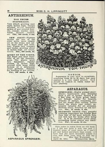 Keywords: Lippincott seeds (15753171553).jpg 18 <br> MISS C H LIPPINCOTT <br> ANTIRRHINUM <br> TOM THUMB <br> SNAPDRAGON <br> Very dwarf growing only <br> eight inches high thickly <br> Btudded with beautiful <br> spikes of gay colored flow- <br> ers orange scarlet rose- <br> white maroon striped <br> etc Fkt 600 seeds 3 cts <br> NEW GIANT ” Flowers <br> double the size of the <br> older sorts more closely <br> set on the stems and col- <br> ors more clear and brill- <br> iant Plants very compact <br> and bushy growing about <br> 12 inches high All colors <br> mixed Pkt 400 seeds 4c <br> QUEEN OF THE NORTH <br> The finest and most beau- <br> tiful of all the Snapdra- <br> gons The plants grow <br> into handsome regular <br> bushes 12 inches high <br> covered with large white <br> flowers of a deliciously <br> sweet perfume Suitable <br> for bedding or pot culture <br> Pkt 400 seeds 4 cts <br> f <br> UiVMr TOl ¢ T <br> NOTICE <br> Asparagus <br> is very slo« <br> to <br> germi <br> nate <br> requiring <br> from 60 <br> to 90 <br> days <br> but <br> once <br> started is <br> a <br> very <br> rapid <br> grower <br> Seed <br> should be <br> soaked <br> in warm <br> water <br> be- <br> fore plant <br> mg <br> ASPARAGUS <br> SPRENGERI ” Highly praised every- <br> where; handsomest seen drooping <br> from a pot or basket Sprays 4 to <br> 6 feet long of fresh green feath- <br> ery foliage; useful for boquets <br> wreaths or sprays remaining per- <br> - for weeks after cutting Grows <br> K P freely the whole year round ; ex- <br> - - tremely valuable for all purposes <br> Flowers white followed by red ber- <br> ries Pkt 15 seeds 8 cts <br> PLUMOSUS NANUS ” This graceful <br> climbing Asparagus has foliage finer <br> than that of the most delicate fern <br> and will last for weeks after being <br> cut It is an excellent house plant <br> succeeding under almost any condi- <br> tion Pkt 10 seeds 10 cts <br> ASPARAGUS SPRENGERI <br> This order is taken from an old book <br> as I did not have a new one and I <br> wanted some of your seeds as I can't <br> get any better anywhere than yours I <br> have had the most beautiful asters I <br> over saw from your seed so will try <br> again Mrs Ray Wainright <br> April 20 1914 Webbervllle Mich 42162037 132824 65968 Page 18 Text http //www biodiversitylibrary org/page/42162037 1915 Henry G Gilbert Nursery and Seed Trade Catalog Collection ; Miss C H Lippincott Firm NameFound Asparagus NameConfirmed Asparagus var pygmaeus Makino EOLID 10487111 NameFound Asparagus sprengeri NameConfirmed Asparagus sprengeri Regel 1890 EOLID 987592 NameFound Nanus NameConfirmed Nanus EOLID 73713 NameBankID 2610066 Biodiversity Heritage Library Lippincott seeds 1915 Garden Stories Catalogs Flowers Fruit Nurseries Horticulture Seeds Vegetables U S Department of Agriculture National Agricultural Library bhl page 42162037 dc identifier http //biodiversitylibrary org/page/42162037 bhlGardenStories BHLinbloom nurseries horticulture u s department of agriculture national agricultural library bhlgardenstories bhlinbloom Information field Flickr posted date ISOdate 2015-01-26 Check categories 2015 August 25 CC-BY-2 0 BioDivLibrary https //flickr com/photos/61021753 N02/15753171553 2015-08-25 05 56 06 cc-by-2 0 PD-old-70-1923 Lippincott seeds Photos uploaded from Flickr by Fæ using a script