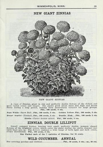 | Keywords: Lippincott seeds (15753445473).jpg MINNEAPOLIS MINN <br> 39 <br> NEW GIANT ZINNIAS <br> NEW GIANT ZINNIAS <br> A class of Zinnias giant in size and perfectly double flowers of the richest and <br> most varied colors and shapes The plants grow about three feet high and bloom <br> freely during a long period making them particularly valuable for large groups <br> Pkt 100 seeds 5 cts <br> Pure White ” Snow Ball Pkt 100 seeds 5 cts <br> Dwarf Scarlet ” Fireball Pkt 100 seeds 5 cts <br> Zinnia ” Choice double mixed <br> Golden Yellow Pkt 100 seeds 5 cts <br> Double Pink Pkt 100 seeds 5 cts <br> Pkt 100 seeds 5 cts <br> ZINNIAS DOUBLE LILLIPUT <br> Dwarf compact bushes bearing very small perfectly double pompon shaped <br> flowers of the brightest colors which cover the plant during the entire summer and <br> until frost sets in The flowers embrace a wide range of both light and dark colors <br> evenly distributed Pkt 100 seeds 5 cts <br> One Packet each of the 7 varieties of Zinnias for 25 cents <br> WILD CUCUMBER ANNUAL <br> For covering porches and trellises Pkt 20 seeds 5 cts ; oz 20 cts 42205447 132981 65968 Page 39 Text http //www biodiversitylibrary org/page/42205447 1915 Henry G Gilbert Nursery and Seed Trade Catalog Collection ; Miss C H Lippincott Firm NameFound Zinnia NameConfirmed Zinnia L EOLID 38874 Biodiversity Heritage Library Lippincott seeds 1916 Garden Stories Catalogs Flowers Fruit Nurseries Horticulture Seeds Vegetables U S Department of Agriculture National Agricultural Library bhl page 42205447 dc identifier http //biodiversitylibrary org/page/42205447 bhlGardenStories BHLinbloom nurseries horticulture u s department of agriculture national agricultural library bhlgardenstories bhlinbloom Information field Flickr posted date ISOdate 2015-01-26 Check categories 2015 August 25 CC-BY-2 0 BioDivLibrary https //flickr com/photos/61021753 N02/15753445473 2015-08-25 05 51 19 cc-by-2 0 PD-old-70-1923 Lippincott seeds Photos uploaded from Flickr by Fæ using a script |