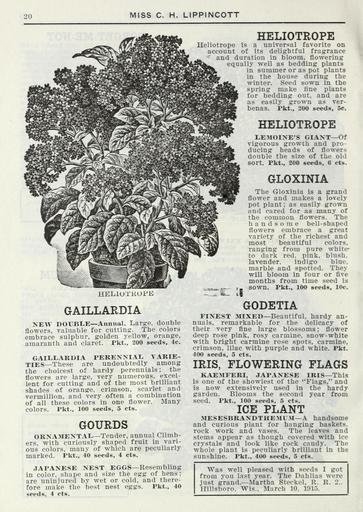 | Keywords: Lippincott seeds (16185762338).jpg 20 <br> MISS C H LIPPINCOTT <br> HELIOTROPE <br> HELlUTKOPE <br> GAILLARDIA <br> NEW DOUBLE Annual Large double <br> flowers valuable for cutting The colors <br> embrace sulphur golden yellow orange <br> amaranth and claret Pkt 200 seeds 4c <br> GAIELARDIA PEKEXNIAE VARIE- <br> TIES These are undoubtedly among <br> the choicest of hardy perennials; the <br> flowers are large very numerous excel- <br> lent for cutting and of the most brilliant <br> shades of orange crimson scarlet and <br> Vermillion and very often a combination <br> of all these colors in one flower Many <br> colors Pkt 100 seeds 5 cts <br> GOURDS <br> ORNAMENTAL Tender annual Climb- <br> ers with curiously shaped fruit in vari- <br> ous colors many of which are peculiarly <br> marked Pkt 40 seeds 4 cts <br> JAPANESE NEST EGGS Resembling <br> in color shape and size the egg of hens <br> are uninjured by wet or cold and there- <br> Core make the best nest eggs Pkt 40 <br> seeds 4 cts <br> Heliotrope is a universal favorite on <br> account of its delightful fragrance <br> and duration in bloom flowering <br> equally well as bedding plants <br> in summer or as pot plants <br> in the house during the <br> winter Seed sown in the <br> spring make fine plants <br> for bedding out and are <br> as easily grown as ver- <br> benas Pkt 200 seeds 5c <br> HELIOTROPE <br> EEMOINE'S GIANT Of <br> vigorous growth and pro- <br> ducing beads of flowers <br> double the size of the old <br> sort Pkt 200 seeds 6 cts <br> GLOXINIA <br> The Gloxinia is a grand <br> flower and makes a lovely <br> pot plant; as easily grown <br> and cared for as many of <br> the common flowers The <br> handsome bell-shaped <br> flowers embrace a great <br> variety of the richest and <br> most beautiful colors <br> ranging from pure white <br> to dark red pink blush <br> lavender indigo blue <br> marble and spotted They <br> will bloom in four or five <br> months from time seed is <br> sown Pkt 100 seeds 10c <br> e \ <br> GODETIA <br> FINEST MIXED Beautiful hardy an- <br> nuals remarkable for the delicacy of <br> their very fine large blossoms; flower <br> deep rose pink rosy carmine snow-white <br> with bright carmine rose spots carmine <br> crimson lilac with purple and white Pkt <br> 400 seeds 5 cts <br> IRIS FLOWERING FLAGS <br> KAEMFERI JAPANESE IRIS This <br> is one of the showiest of the Flags and <br> is now extensively used in the hardy <br> garden Blooms the second year from <br> seed Pkt 100 seeds 5 cts <br> ICE PLANT <br> 3IESESBRANDTHEMIM A handsome <br> and curious plant for hanging baskets <br> rock work and vases The leaves and <br> stems appear as though covered with ice <br> crystals and look like rock candy The <br> whole plant is peculiarly brilliant in the <br> sunshine Pkt 400 seeds 5 cts <br> Was well pleased with seeds I got <br> from you last year The Dahlias were <br> just grand Martha Stockel R R 2 <br> Hillsboro Wis March 10 1915 42205428 132981 65968 Page 20 Text http //www biodiversitylibrary org/page/42205428 1915 Henry G Gilbert Nursery and Seed Trade Catalog Collection ; Miss C H Lippincott Firm NameFound Gaillardia NameConfirmed Gaillardia Foug EOLID 38325 NameFound Gloxinia NameConfirmed Gloxinia L'Her EOLID 72184 NameFound Godetia NameConfirmed Godetia EOLID 5466836 NameBankID 3471363 Biodiversity Heritage Library Lippincott seeds 1916 Garden Stories Catalogs Flowers Fruit Nurseries Horticulture Seeds Vegetables U S Department of Agriculture National Agricultural Library bhl page 42205428 dc identifier http //biodiversitylibrary org/page/42205428 bhlGardenStories BHLinbloom nurseries horticulture u s department of agriculture national agricultural library bhlgardenstories bhlinbloom Information field Flickr posted date ISOdate 2015-01-26 Check categories 2015 August 25 CC-BY-2 0 BioDivLibrary https //flickr com/photos/61021753 N02/16185762338 2015-08-25 05 56 58 cc-by-2 0 PD-old-70-1923 Lippincott seeds Photos uploaded from Flickr by FĂŚ using a script |
