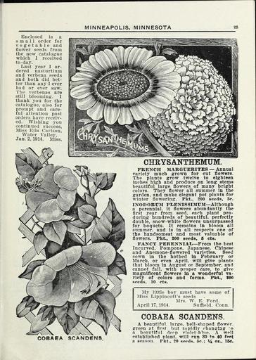 | Keywords: Lippincott seeds (16187300337).jpg MINNEAPOLIS MINNESOTA <br> Enclosed is a <br> small order for <br> vegetable and <br> flower seeds from <br> the new catalogue <br> which I received <br> to-day <br> Last year I or- <br> dered nasturtium <br> and verbena seeds <br> and both did bet- <br> ter than any I ever <br> had or ever saw <br> The verbenas are <br> still blooming I <br> thank you for the <br> catalogue also for <br> prompt and care- <br> ful attention past <br> orders have receiv- <br> ed Wishing you <br> continued success <br> Miss Ella Carlson <br> Water Valley <br> Jan 2 1914 Miss <br> CHRYSANTHEMUM <br> FRENCH ItfARGUERITES ” Annual <br> variety much grown for cut flowers <br> The plants grow twelve to eighteen <br> inches high and produce on long stems <br> beautiful large flowers of many bright <br> colors They flower all summer in the <br> garden and make elegant pot plants for <br> winter flowering Pkt 200 seeds 3c <br> INODORUM PIwENISSIMUM ” Although <br> a perennial it flowers abundantly the <br> first year from seed each plant pro- <br> ducing hundreds of beautiful perfectly <br> double snow-white flowers unsurpassed <br> for boquets It remains in bloom all <br> summer and is in all respects one of <br> the handsomest and most valuable of <br> flowers Pkt 200 seeds S cts <br> FANCY PERENNIAL ” From the best <br> Incurved Pompone Japanese Chinese <br> and Anemone-flowered varieties Seed <br> sown in the hotbed In February or <br> March or even April will give plants <br> that bloom in August or September and <br> cannot fall with proper care to give <br> magnificent flowers In a wonderful va- <br> riety of colors and forms Pkt 200 <br> seeds 10 cts <br> My little boy must have some of <br> Miss Lippincott's seeds <br> Mrs W E Ford <br> April 17 1914 Suflleld Conn <br> COBAEA SCANDEN8 <br> COBAEA SCANDENS <br> A beautiful large bell-shaped flower <br> green at first but rapidly changing 'o <br> a beautiful deep violet-blue A well <br> established plant will run 30 to 40 f«» »t <br> a season I kt 20 seeds 5c ; oi 15c 42162030 132824 65968 Page 25 Text http //www biodiversitylibrary org/page/42162030 1915 Henry G Gilbert Nursery and Seed Trade Catalog Collection ; Miss C H Lippincott Firm NameFound Chrysanthemum NameConfirmed Chrysanthemum EOLID 38388 NameBankID 2657422 NameFound Cobaea NameConfirmed Cobaea EOLID 5694106 NameBankID 1778130 NameFound Cobaea scandens NameConfirmed Cobaea scandens EOLID 6359727 NameBankID 1672054 Biodiversity Heritage Library Lippincott seeds 1915 Garden Stories Catalogs Flowers Fruit Nurseries Horticulture Seeds Vegetables U S Department of Agriculture National Agricultural Library bhl page 42162030 dc identifier http //biodiversitylibrary org/page/42162030 bhlGardenStories BHLinbloom nurseries horticulture u s department of agriculture national agricultural library bhlgardenstories bhlinbloom Information field Flickr posted date ISOdate 2015-01-26 Check categories 2015 August 25 CC-BY-2 0 BioDivLibrary https //flickr com/photos/61021753 N02/16187300337 2015-08-25 05 54 06 cc-by-2 0 PD-old-70-1923 Lippincott seeds Photos uploaded from Flickr by Fæ using a script |