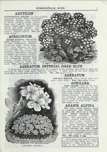 Keywords: Lippincott seeds (16187489117).jpg MINNEAPOLIS MINN <br> ABUTILON <br> FLOWERING MAPLE A \ei popular <br> Dereunial shrub with bell shaped <br> drooping flowers well adapted <br> to house culture easily raided <br> from seed and if sown before <br> April under glass plants will <br> bloom the first season For <br> winter flowering plant in Sep- <br> tember Finest mixed Pkt 30 <br> seeds 8 cts <br> ACROLINIUM <br> EVERLASTING One of the <br> most beautiful and valuable <br> of the everlasting flower <br> called by some Pink Dais <br> ies ; very effective in bor- <br> ders during the blo - ' 'uin <br> seasons and possessing the <br> additional advantage of being <br> available for winter decora- <br> tion for which purpose it is <br> now extensively grown The <br> densely double flowers are <br> faultless both in shape and <br> color Pkt 100 seeds 4 ots <br> AGERATUM IMPERIAL DARK BLUE <br> A plant that blooms continuously all summer in the garden and makes a <br> contrast of color with more brilliant varieties I offer seed of the new <br> Dark Blue as the best and most showy Pkt 300 seeds 5 n <br> AGERATUM <br> pleasing <br> Imperial <br> DWARF WHITE Very dwarf and com-- <br> pact; pure white Pkt 300 seeds 5 cts <br> ACHILLEA <br> THE PEARL One of the best <br> hardy white perennials in the <br> list Grow s about two feet high <br> and from spring till frost is cov- <br> ered with heads of pure white <br> double flowers A grand plant <br> for cemetery decoration Easily <br> srrown from seed flowering the <br> first season if sown early Pkt <br> 300 seeds 5 cts <br> ARABIS ALPINA <br> The pure white flowers grow <br> so uniformly and thickly that <br> it gives the effect of a sheet of <br> snow Plants perfectly hardy <br> The earliest prettiest spring <br> flower The spreading tufts are <br> densely clothed with neat lively <br> green leaves and covered with <br> pure white flowers; conspicuous <br> at a great distance especially <br> in large masses on rockeries or <br> broad edgings for park roads <br> having the advantage of braving <br> the greatest drought during sum- <br> mer and always looking neat <br> Pkt 400 seeds 5 cts <br> ARABIS ALPINA <br> HaA'e used your seed for many <br> years and find them very satis- <br> factory Mrs A M King <br> Apr 1 '15 Rutherford N 1 42205411 132981 65968 Page 3 Text http //www biodiversitylibrary org/page/42205411 1915 Henry G Gilbert Nursery and Seed Trade Catalog Collection ; Miss C H Lippincott Firm NameFound Abutilon NameConfirmed Abutilon hybrid EOLID 71367 NameFound ACHILLEA NameConfirmed Achillea EOLID 36945 NameBankID 2657276 NameFound Ageratum NameConfirmed Ageratum L EOLID 59467 NameFound Arabis alpina NameConfirmed Arabis alpina EOLID 584157 NameBankID 2648388 Biodiversity Heritage Library Lippincott seeds 1916 Garden Stories Catalogs Flowers Fruit Nurseries Horticulture Seeds Vegetables U S Department of Agriculture National Agricultural Library bhl page 42205411 dc identifier http //biodiversitylibrary org/page/42205411 bhlGardenStories BHLinbloom nurseries horticulture u s department of agriculture national agricultural library bhlgardenstories bhlinbloom Information field Flickr posted date ISOdate 2015-01-26 Check categories 2015 August 25 CC-BY-2 0 BioDivLibrary https //flickr com/photos/61021753 N02/16187489117 2015-08-25 05 53 12 cc-by-2 0 PD-old-70-1923 Lippincott seeds Photos uploaded from Flickr by FĂŚ using a script |