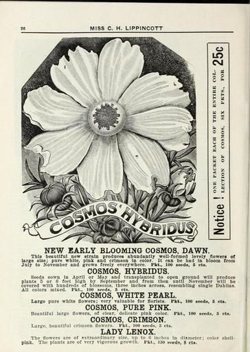 | Keywords: Lippincott seeds (16371452421).jpg 26 <br> MISS C H LIPPINCOTT <br> in <br> CNJ <br> a <br> o o <br> H fa <br> H O <br> 1 1 <br> c <br> »-a <br> O <br> NEW EARLY BLOOMING COSMOS DAWN <br> This beautiful new strain produces abundantly well-formed lovely flowers of <br> large size; pure white pink and crimson In color It can be had In bloom from <br> July to November and grows freely everywhere Pkt 100 seeds 5 cts <br> COSMOS HYBRIDUS <br> Seeds sown In April or May and transplanted to open ground will produce <br> plants 5 or 6 feet high by September and from then until November will be <br> covered with hundreds of blossoms three inches across resembling single Dahlias <br> All colors mixed Pkt 100 seeds 5 cts <br> COSMOS WHITE PEARL <br> Large pure white flowers; very valuable for florists Pkt 100 seeds 6 cts <br> COSMOS PURE PINK <br> Beautiful large flowers of clear delicate pink color Pkt 100 seeds 5 cts <br> COSMOS CRIMSON <br> Large beautiful crimson flowers Pkt 100 seeds 5 cts <br> LADY LENOX <br> The flowers are of extraordinary size up to G inches in diameter; color shell- <br> pink The plants are of very vigorous growth Pkt 150 seed 8 ct» <br> 1 42162029 132824 65968 Page 26 Text http //www biodiversitylibrary org/page/42162029 1915 Henry G Gilbert Nursery and Seed Trade Catalog Collection ; Miss C H Lippincott Firm NameFound Hybridus NameConfirmed Hybridus NameBankID 4200014 Biodiversity Heritage Library Lippincott seeds 1915 Garden Stories Catalogs Flowers Fruit Nurseries Horticulture Seeds Vegetables U S Department of Agriculture National Agricultural Library bhl page 42162029 dc identifier http //biodiversitylibrary org/page/42162029 bhlGardenStories BHLinbloom nurseries horticulture u s department of agriculture national agricultural library bhlgardenstories bhlinbloom Information field Flickr posted date ISOdate 2015-01-26 Check categories 2015 August 25 CC-BY-2 0 BioDivLibrary https //flickr com/photos/61021753 N02/16371452421 2015-08-25 05 52 48 cc-by-2 0 PD-old-70-1923 Lippincott seeds Photos uploaded from Flickr by Fæ using a script |