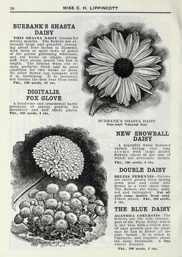 | Keywords: Lippincott seeds (16373391655).jpg 16 <br> MISS C H LIPPINCOTT <br> BURBANK'S SHASTA <br> DAISY <br> THIS SHASTA DAISY blooms for <br> several months The flowers are ex- <br> tremely large and graceful averag- <br> ing about four inches in diameter <br> with three or more rows of petals <br> of the purest glistening whiteness <br> and are borne on single strong <br> stiff wiry stems nearly two feet in <br> length The blooms when cut re- <br> main perfectly fresh and in good <br> condition for two weeks or more <br> No other flower can compare with <br> it in usefulness It is perennial <br> but blooms the first year from seeds <br> Pkt 100 seeds 10 cts <br> DIGITALIS <br> FOX GLOVE <br> A handsome and ornamental hardy <br> perennial of stately growth for <br> shrubbery and half shady places <br> Pkt 500 seeds 4 cts <br> BURBANK'S SHASTA DAISY <br> One-half Natural Size <br> NEW SNOWBALL <br> DAISY <br> A beautiful white flowered <br> variety having very long <br> stems with large double <br> flowers about 80 per cent of <br> which are extremely double <br> Pkt 300 seeds 5 cts <br> DOUBLE DAISY <br> BELLIS PERENNIS ” Daisies <br> are easily grown from spring <br> sown seed and come into <br> flower in a very short time <br> The flowers are white pink <br> red and variegated Not all <br> will come double from seed <br> Finest mixed Pkt 300 seeds <br> 5 cts <br> THE BLUE DAISY <br> AGATHE V COELESTIS The <br> flowers are the very counter- <br> part of the Paris Daisy which <br> is sky blue with a yellow disc <br> Of easy growth and the plant <br> may be had in flower all the <br> year 'round It is allied to <br> Cineraria and requires about <br> the same treatment \ fine <br> winter bloomer <br> Pkt 200 seeds 5 cts 42205424 132981 65968 Page 16 Text http //www biodiversitylibrary org/page/42205424 1915 Henry G Gilbert Nursery and Seed Trade Catalog Collection ; Miss C H Lippincott Firm NameFound Bellis perennis NameConfirmed Bellis perennis EOLID 467843 NameBankID 2658155 NameFound CINERARIA NameConfirmed Cineraria EOLID 6258313 NameBankID 1674869 NameFound CINERARIA NameConfirmed Cineraria EOLID 6258313 NameBankID 4894724 NameFound Coelestis NameConfirmed Coelestis EOLID 8889111 NameBankID 3009138 Biodiversity Heritage Library Lippincott seeds 1916 Garden Stories Catalogs Flowers Fruit Nurseries Horticulture Seeds Vegetables U S Department of Agriculture National Agricultural Library bhl page 42205424 dc identifier http //biodiversitylibrary org/page/42205424 bhlGardenStories BHLinbloom nurseries horticulture u s department of agriculture national agricultural library bhlgardenstories bhlinbloom Information field Flickr posted date ISOdate 2015-01-26 Check categories 2015 August 25 CC-BY-2 0 BioDivLibrary https //flickr com/photos/61021753 N02/16373391655 2015-08-25 05 51 15 cc-by-2 0 PD-old-70-1923 Lippincott seeds Photos uploaded from Flickr by Fæ using a script |