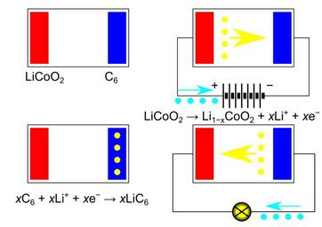 | Keywords: Lithium cobaltate vs graphite lithium-ion battery scheme.png en A scheme of lithium-ion battery with lithium cobaltate and graphite as electrode materials Top left uncharged state Top right charging process a de-intercalation half-reaction is given Bottom left a charged state with lithium ions intercalated into graphite an intercalation half-reaction is given Bottom right discharge process ru Схема аботы литий-ионного аккумулято а с элект одами из кобальтата лития и г афита Вве ху слева аз яженное состояние Вве ху сп ава п оцесс за яда п иведена полу еакция деинте каляции Внизу слева за яженное состояние ионы лития инте кали ованы в г афит п иведена полу еакция инте каляции Внизу сп ава п оцесс аз яда 2016-02-07 own Sergey WereWolf other versions cc-zero Electric battery schemas Lithium batteries Created with Inkscape |