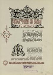| Keywords: Litsevoy i Letopisniy izbornik doma Romanovykh - page 017.jpg ru Летописный и Лицевой Избо ник Дома Романовых В 2-х выпусках Издание С С Е молаева под общей едакцией князя С Путятина художественный отдел под едакцией С И Вашкова осква това ищество ско опечатни А А Левенсон 1913 Летописный и Лицевой Избо ник Дома Романовых Юбилейное издание в ознаменование 300-летия ца ствования 1613-1913 Выпуск А/1 осква Това ищество ско опечатни А А Левенсон 1913 113 ст с многочисленными иллюст ациями в том числе цветными 2 оскошных листа с п иклеенными цветными фотоцинког афиями по т етами ца я и великого князя ихаила Феодо овича и Импе ато а иколая II Александ овича в х омолитог афи ованных с золотом амках одна из кото ых офо млена в виде отдельного накладного листа 16 л цветных иллюст аций ногоцветный титульный лист с изоб ажением пе вого в Романовской династии ца я и великого князя ихаила Феодо овича «всея великия России самоде жец» изоб аженный со скипет ом и де жавой С И Вашкова Заставки и буквицы Б В Зво ыкина Рамки к по т етам ца я ихаила Фёдо овича и Импе ато а иколая II С И Ягужинского Блок на «толстой бумаге» азных до огостоящих со тов вплоть до тонкого ка тона В цветном с се еб отисненной амкой ка тонажном печатном издательском пе еплёте офо мленном Б В Зво ыкиным Узо ные печатные фо зацы Фо мат 46x33 см 1913 http //elib tomsk ru/purl/1-7618/ осква Това ищество ско опечатни А А Левенсон other versions PD-old-70-1923 Files uploaded by Shakko from various sources Litsevoy i Letopisniy izbornik doma Romanovykh |