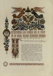 | Keywords: Litsevoy i Letopisniy izbornik doma Romanovykh - page 027.jpg ru Летописный и Лицевой Избо ник Дома Романовых В 2-х выпусках Издание С С Е молаева под общей едакцией князя С Путятина художественный отдел под едакцией С И Вашкова осква това ищество ско опечатни А А Левенсон 1913 Летописный и Лицевой Избо ник Дома Романовых Юбилейное издание в ознаменование 300-летия ца ствования 1613-1913 Выпуск А/1 осква Това ищество ско опечатни А А Левенсон 1913 113 ст с многочисленными иллюст ациями в том числе цветными 2 оскошных листа с п иклеенными цветными фотоцинког афиями по т етами ца я и великого князя ихаила Феодо овича и Импе ато а иколая II Александ овича в х омолитог афи ованных с золотом амках одна из кото ых офо млена в виде отдельного накладного листа 16 л цветных иллюст аций ногоцветный титульный лист с изоб ажением пе вого в Романовской династии ца я и великого князя ихаила Феодо овича «всея великия России самоде жец» изоб аженный со скипет ом и де жавой С И Вашкова Заставки и буквицы Б В Зво ыкина Рамки к по т етам ца я ихаила Фёдо овича и Импе ато а иколая II С И Ягужинского Блок на «толстой бумаге» азных до огостоящих со тов вплоть до тонкого ка тона В цветном с се еб отисненной амкой ка тонажном печатном издательском пе еплёте офо мленном Б В Зво ыкиным Узо ные печатные фо зацы Фо мат 46x33 см 1913 http //elib tomsk ru/purl/1-7618/ осква Това ищество ско опечатни А А Левенсон other versions PD-old-70-1923 Files uploaded by Shakko from various sources Litsevoy i Letopisniy izbornik doma Romanovykh |