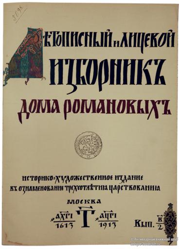 | Keywords: Litsevoy i Letopisniy izbornik doma Romanovykh - cover 04.png ru Летописный и Лицевой Избо ник Дома Романовых В 2-х выпусках Издание С С Е молаева под общей едакцией князя С Путятина художественный отдел под едакцией С И Вашкова осква това ищество ско опечатни А А Левенсон 1913 Летописный и Лицевой Избо ник Дома Романовых Юбилейное издание в ознаменование 300-летия ца ствования 1613-1913 Выпуск А/1 осква Това ищество ско опечатни А А Левенсон 1913 113 ст с многочисленными иллюст ациями в том числе цветными 2 оскошных листа с п иклеенными цветными фотоцинког афиями по т етами ца я и великого князя ихаила Феодо овича и Импе ато а иколая II Александ овича в х омолитог афи ованных с золотом амках одна из кото ых офо млена в виде отдельного накладного листа 16 л цветных иллюст аций ногоцветный титульный лист с изоб ажением пе вого в Романовской династии ца я и великого князя ихаила Феодо овича «всея великия России самоде жец» изоб аженный со скипет ом и де жавой С И Вашкова Заставки и буквицы Б В Зво ыкина Рамки к по т етам ца я ихаила Фёдо овича и Импе ато а иколая II С И Ягужинского Блок на «толстой бумаге» азных до огостоящих со тов вплоть до тонкого ка тона В цветном с се еб отисненной амкой ка тонажном печатном издательском пе еплёте офо мленном Б В Зво ыкиным Узо ные печатные фо зацы Фо мат 46x33 см 1913 http // осква Това ищество ско опечатни А А Левенсон other versions PD-old-70-1923 Files uploaded by Shakko from various sources Litsevoy i Letopisniy izbornik doma Romanovykh |