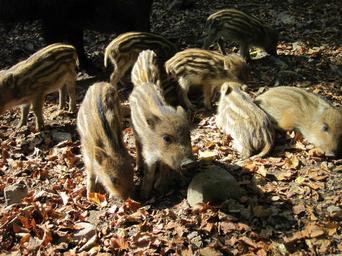 Keywords: little pig wild boars young animals nature forest mammal family head drawing rooting sun autumn leaves litter