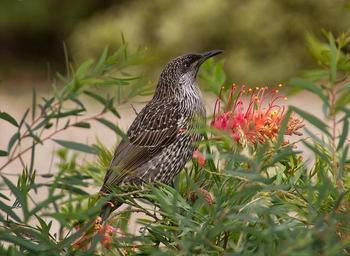 Keywords: little wattle-bird bird feathers speckled grey brown native flower grevillea shrub australian wild wildlife